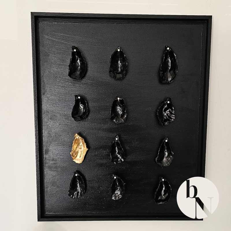 Een minimalistisch en krachtig werk waarin contrast centraal staat. Op een diepzwarte achtergrond zijn twaalf oesterschelpen zorgvuldig geplaatst in een strakke compositie. Eén daarvan is volledig goud geschilderd en vormt direct de blikvanger: een subtiel maar duidelijk symbool van uniciteit, durf en eigenheid.