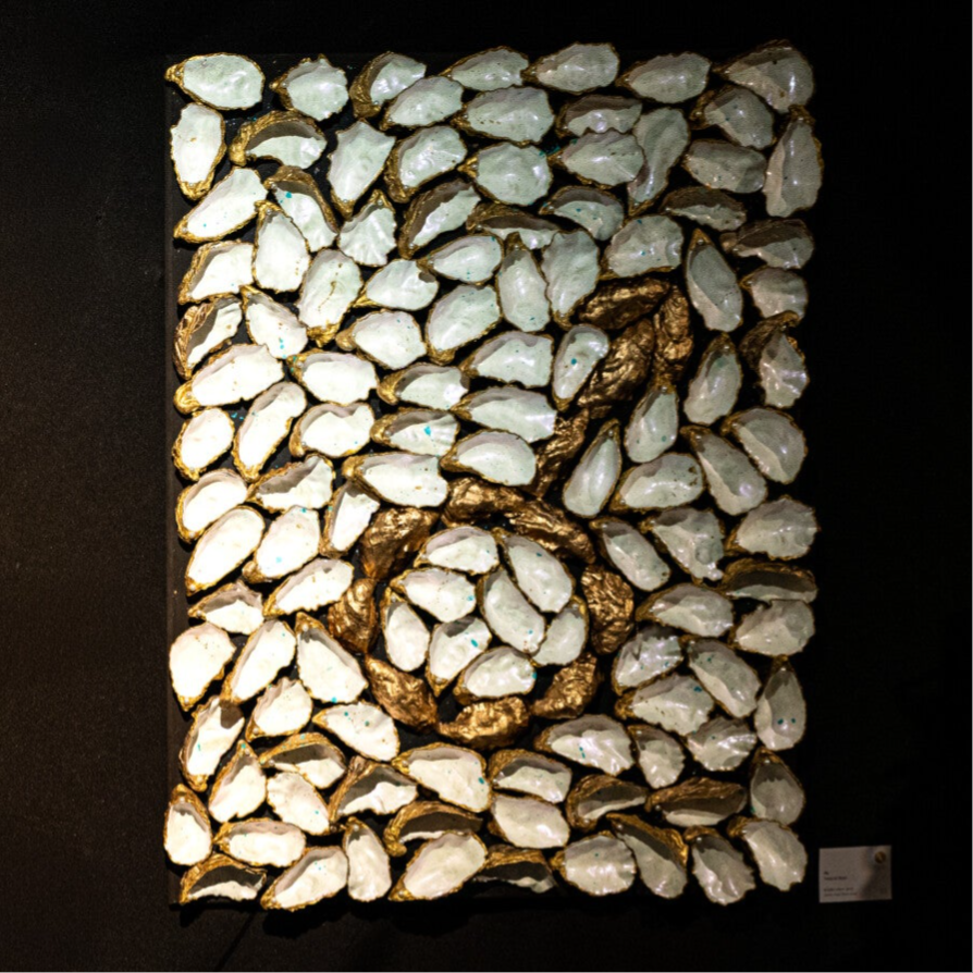 | Materials | Oyster shells • acrylic paint • lacquer • faux pearls • panel |