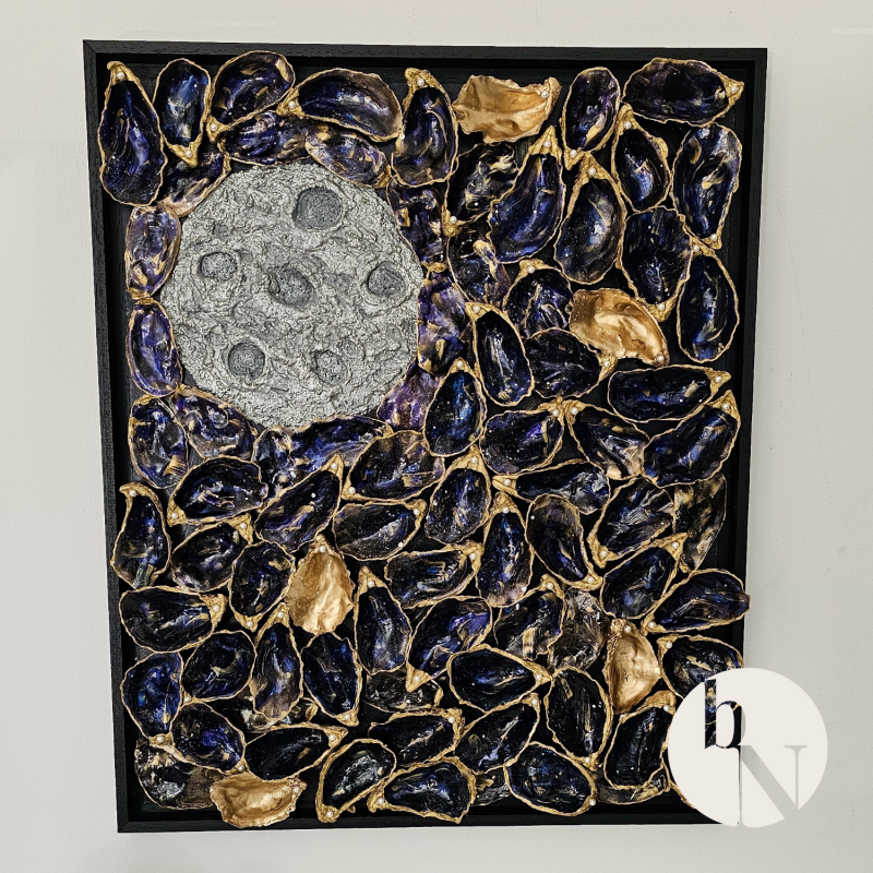 Voor dit werk koos ik bewust voor een combinatie van de boven- én onderzijde van de oesterschelpen, wat zorgt voor extra gelaagdheid en diepte. De maan is met de hand gevormd en bewerkt met zilvertextuur, waardoor een subtiel reliëf ontstaat dat doet denken aan een maanlandschap. De schelpen zijn met zorg geselecteerd, geverfd en gelakt voor een glanzend, bijna buitenaards effect.