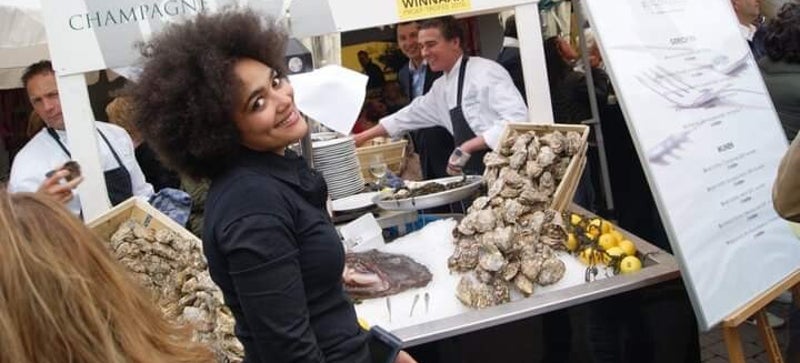 Ik verkocht de oesters, schonk (en dronk) champagne en was in contact met het publiek. Soms had men een wat extra stimulans nodig om voor het eerst een oester te proberen. En de blikken van van mensen blijft enorm mooi.
