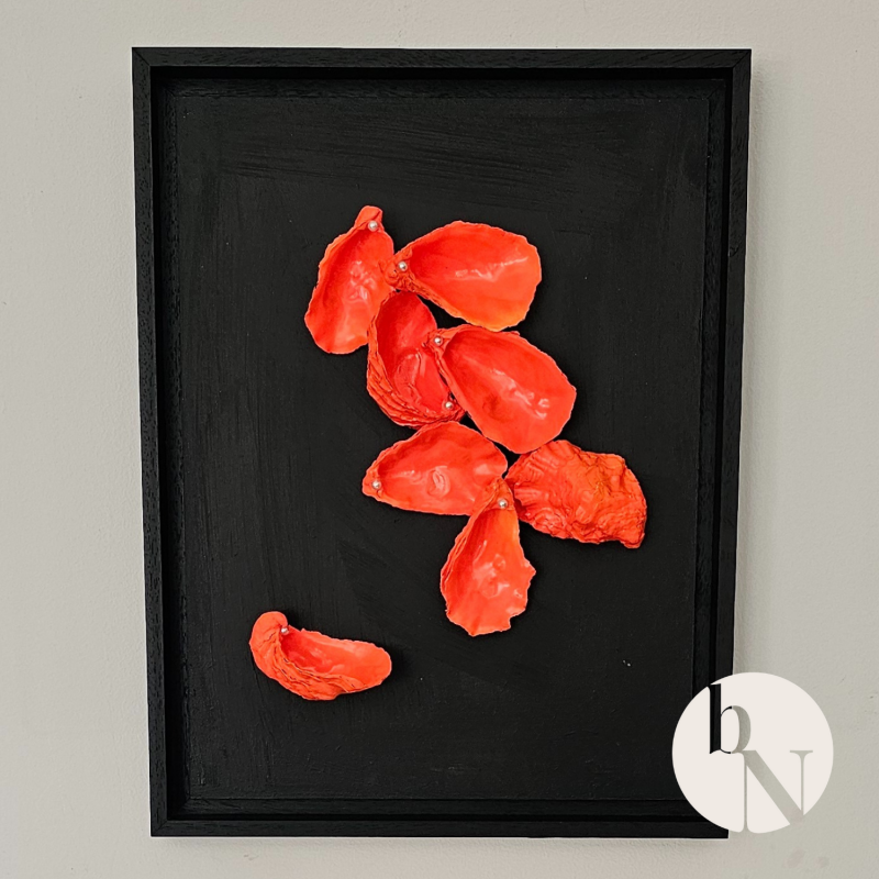 Warm, krachtig en vol beweging. De neonoranje oesters geven dit stuk een vurige uitstraling die je aandacht direct grijpt.